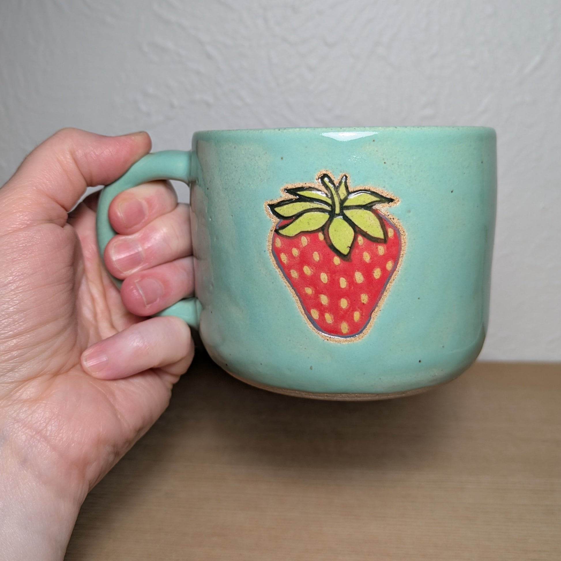 Strawberry coffee mug! Glazed in turquoise. Handmade with love!